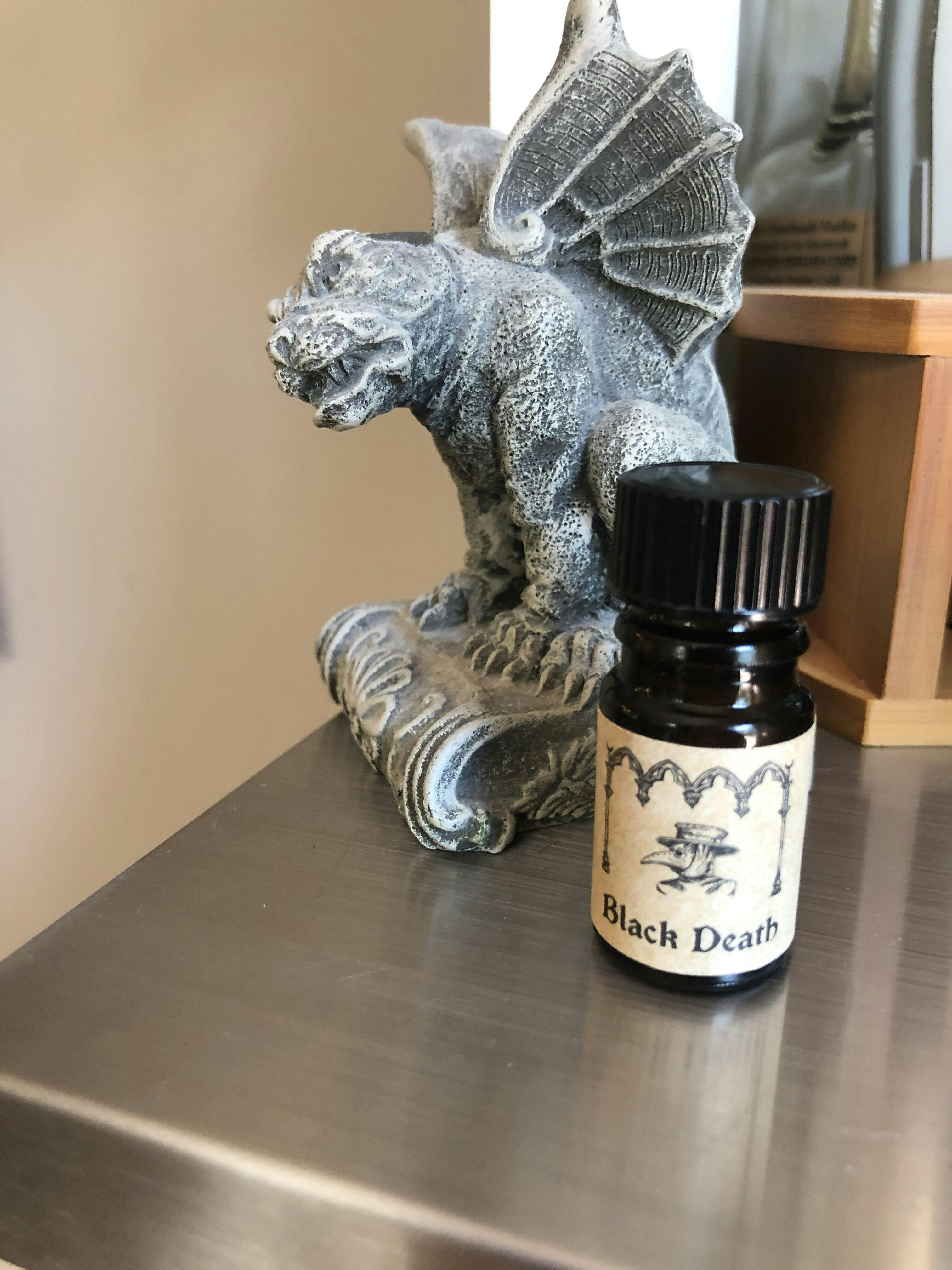 As with ALL Arcana scents, Black Death is fabulous. It is amazing how they are capable of always coming up with unique, fascinating and personal scents that fit the seasons so well. I have MANY MANY Arcana scents, from years ago to recent ones, that I wear all the time. THANK YOU for maintaining such superior quality all these years, and for still offering the longer lasting oils. Love them, love ARCANA!