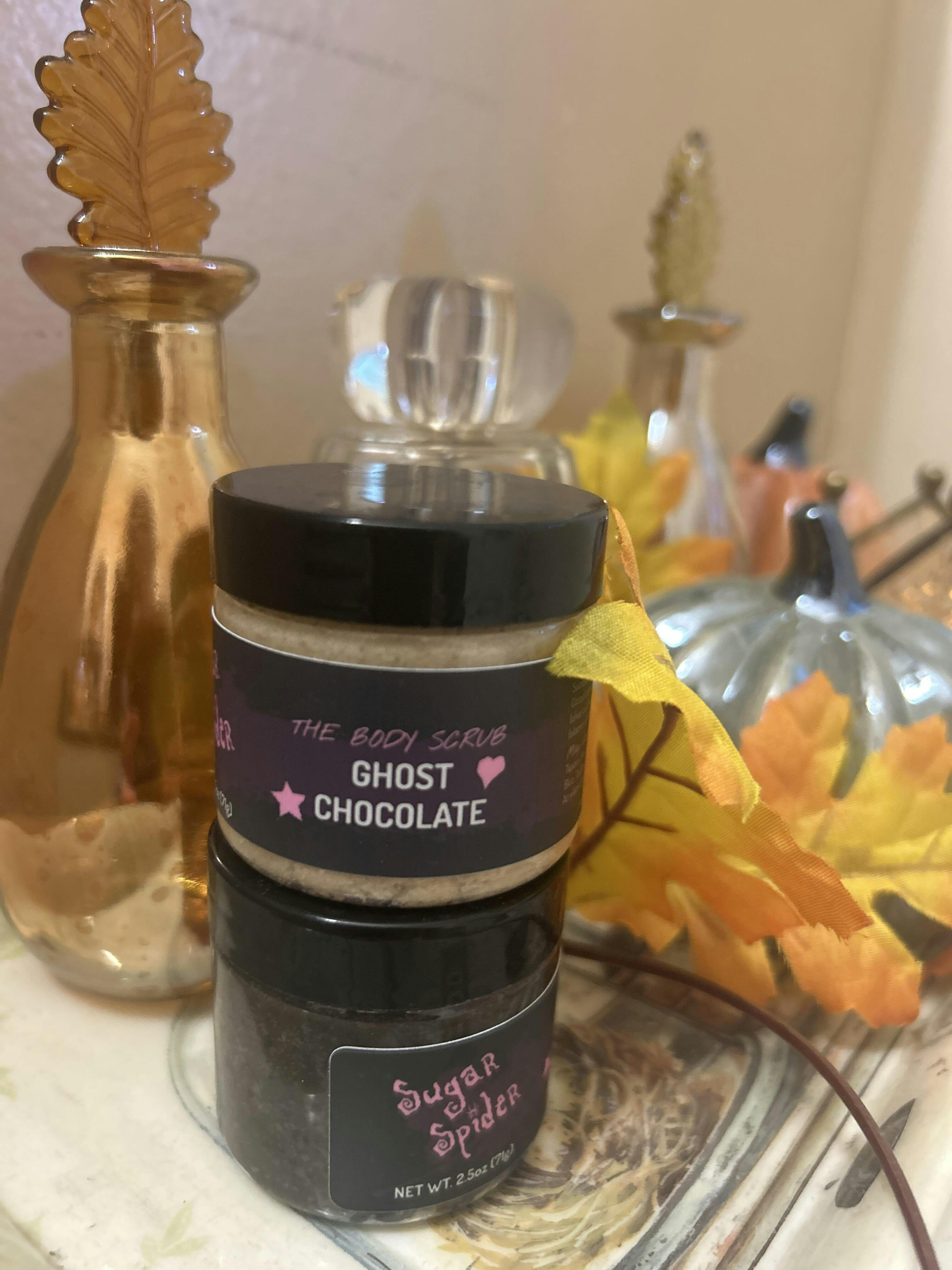 Ghost Chocolate Body Scrub: Belgian white chocolate and creamy cocoa butter rest on a base of delicately haunted musk.
