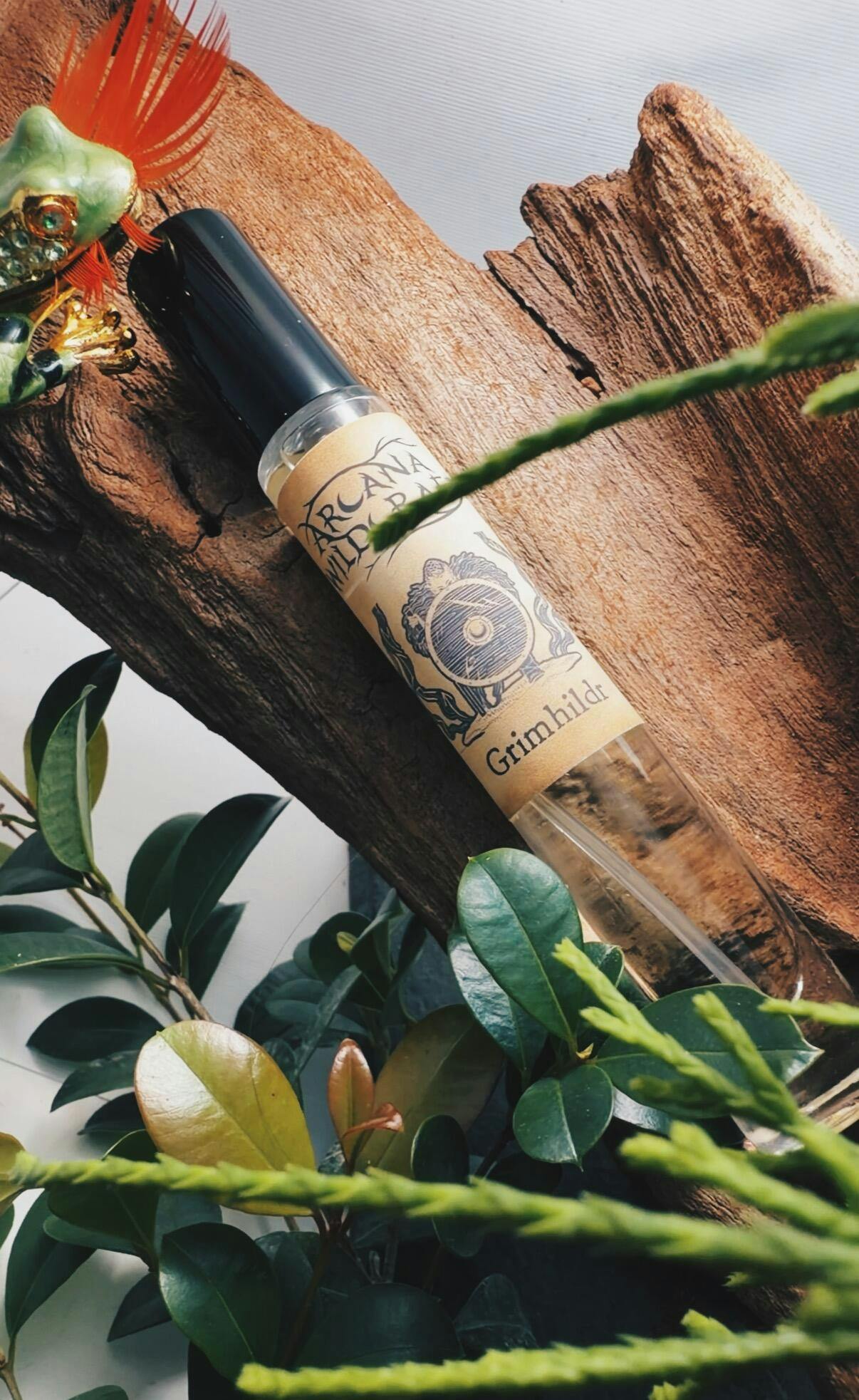Grímhildr: For this beautiful and evil Viking sorceresss, almost a rose soliflore: a profusion of blood red roses with dark musks, forest mosses, black silk, luxurious amber, delicate woods, and our hand-extracted fir essential oil.