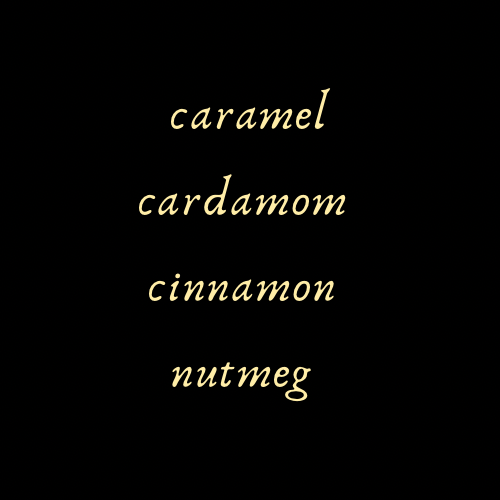 Poudre Douce: Translating to sweet powder, poudre douce is a delicious spice mix dating back to the Middle Ages. Ribbons of warm, melted caramel are spiced with golden cardamom, Ceylon cinnamon, and toasty nutmeg.
