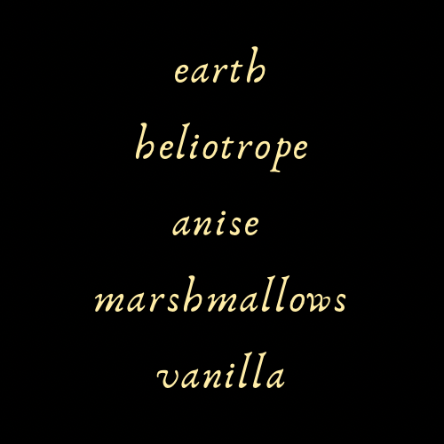 Silent in the Snow: (new) The essence of hush and calm. An opening of soft paw-trod earth leads to a heart of flowery heliotrope and sweet anise. The drydown reveals plump marshmallows, diaphanous white musks, and a trio of thick, fluffy vanillas.