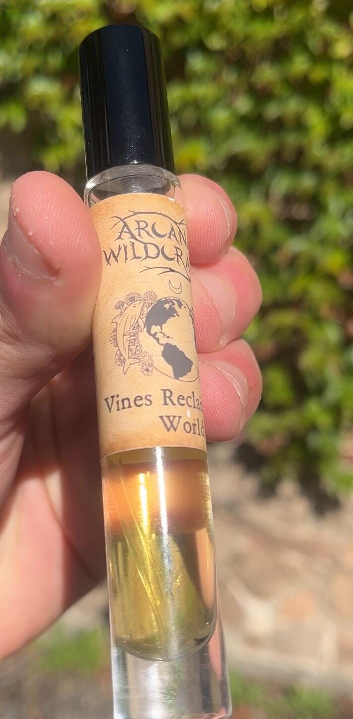 Vines Reclaim the World: (NEW) In our vision of a people-free utopia, lush greenery engulfs cars first, then skyscrapers, then entire cities. An opening of green, humid vines, aromatic herbs, and wool absolute leads to a heart of petrichor, violet leaf, raw silk, soft musks, our hand-distilled rosemary, bright galbanum, moss, grass, and salt.